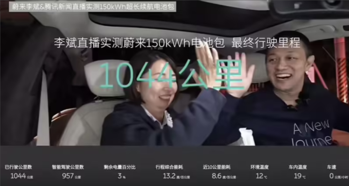 2023年12月,蔚来董事长李斌开着一辆搭载了150kWh电板包的ET7,从上海沿途向南,开启了直播续航长测。完成从上海到厦门的远程奔袭,全程1044公里,途中莫得进行任何神情的补能。当这块150kWh电板包剩余电量还剩3%时,李斌驾驶ET7照旧开了1044km。